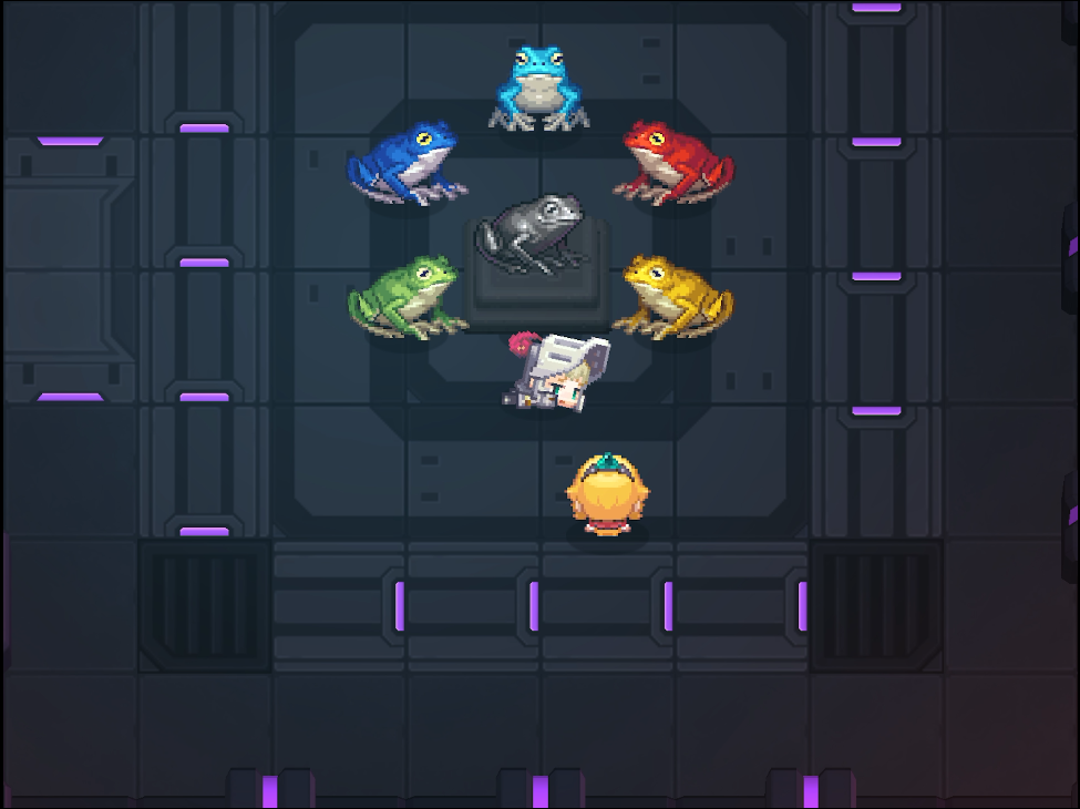2. 15-3 병기 격납고에서 개구리 동상을 볼 수 있다. 빨강 개구리는 전기를 연결하고 총을 건네주면 된다.