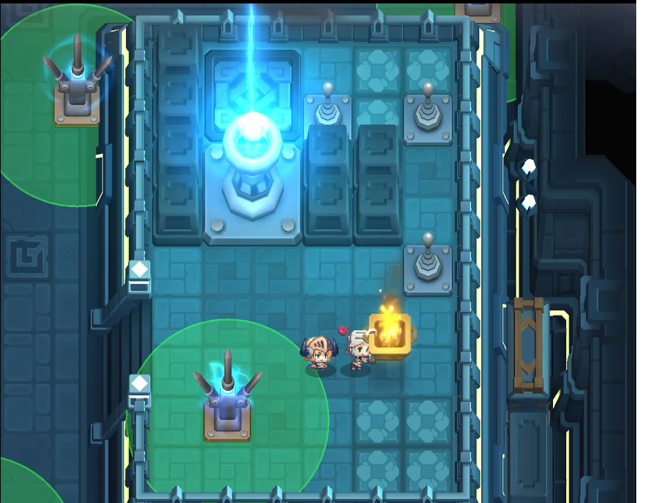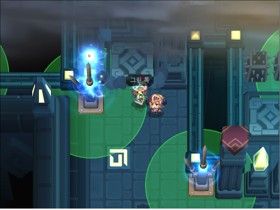 바위를 2개 밀어서 왼쪽 스위치 4개를 눌러둔다. 남은 바위 1개로 오른쪽 스위치 2개를 누른다. 남은 스위치는 직접 밟는다. 전기가 흐르며 전력장치2가 작동한다.