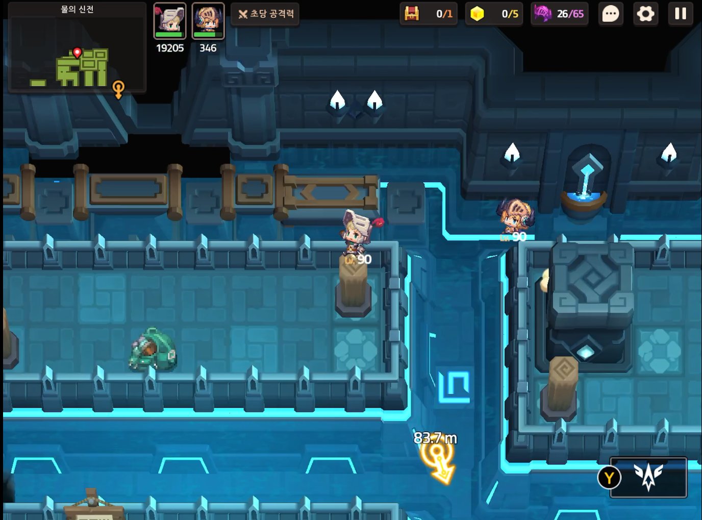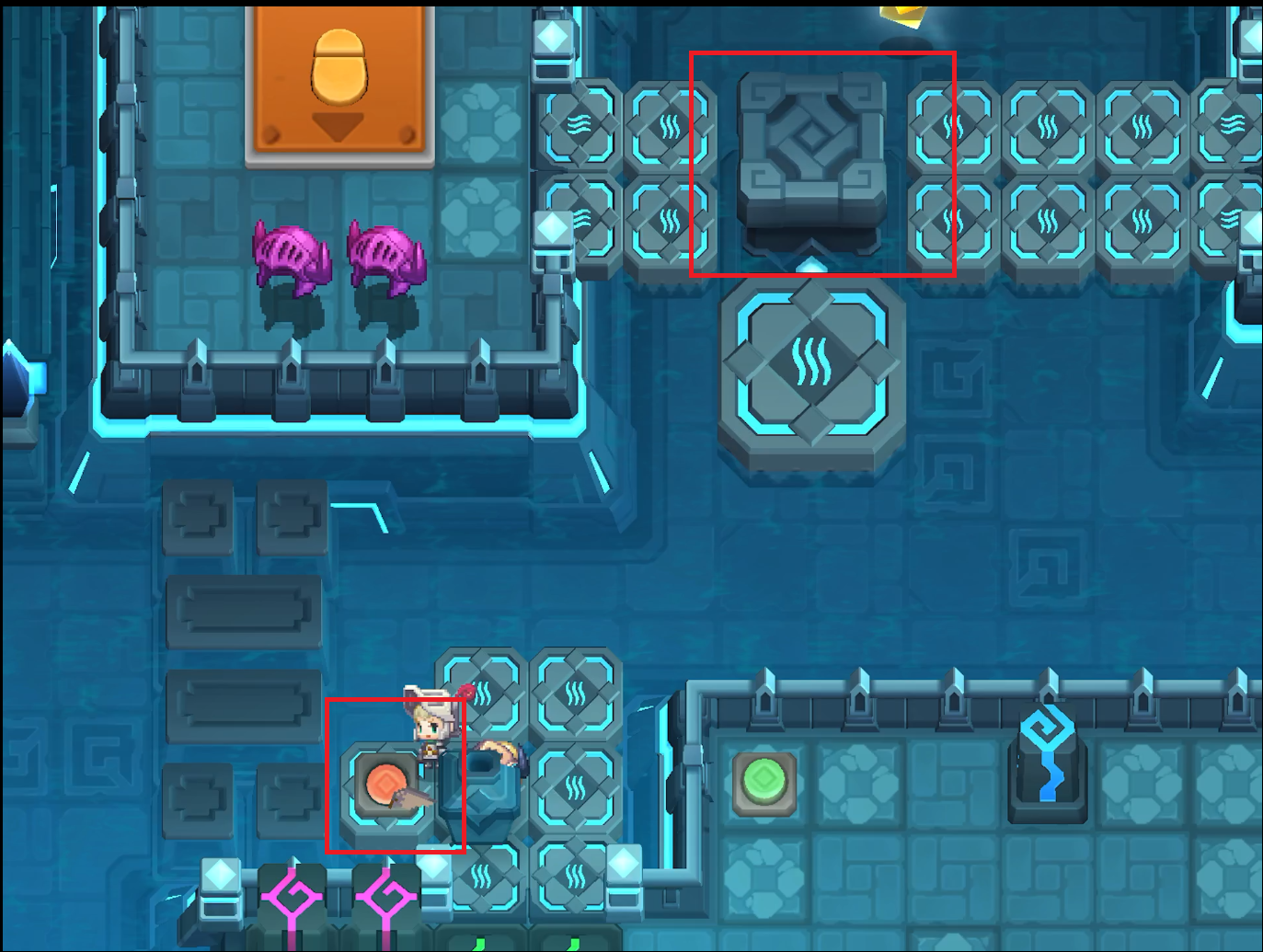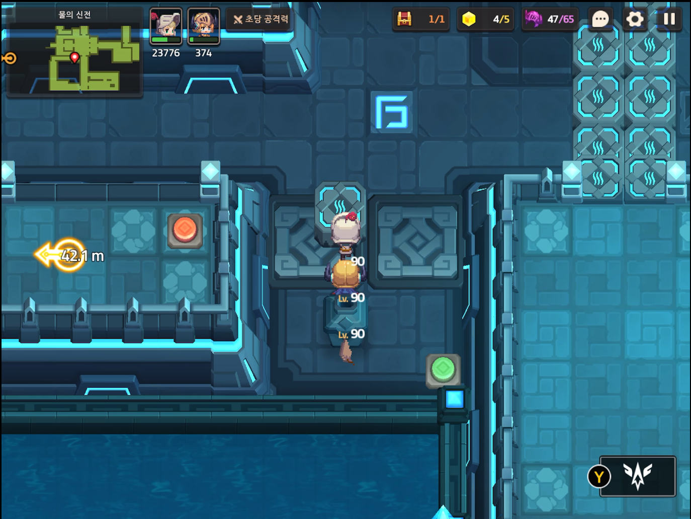 부표와 스위치를 위의 사진 처럼 배치하고 건너가서 MK.99에게 말을 건다. 서브 스테이지 16-19 전투형 안드로이드 추적이 오픈된다.