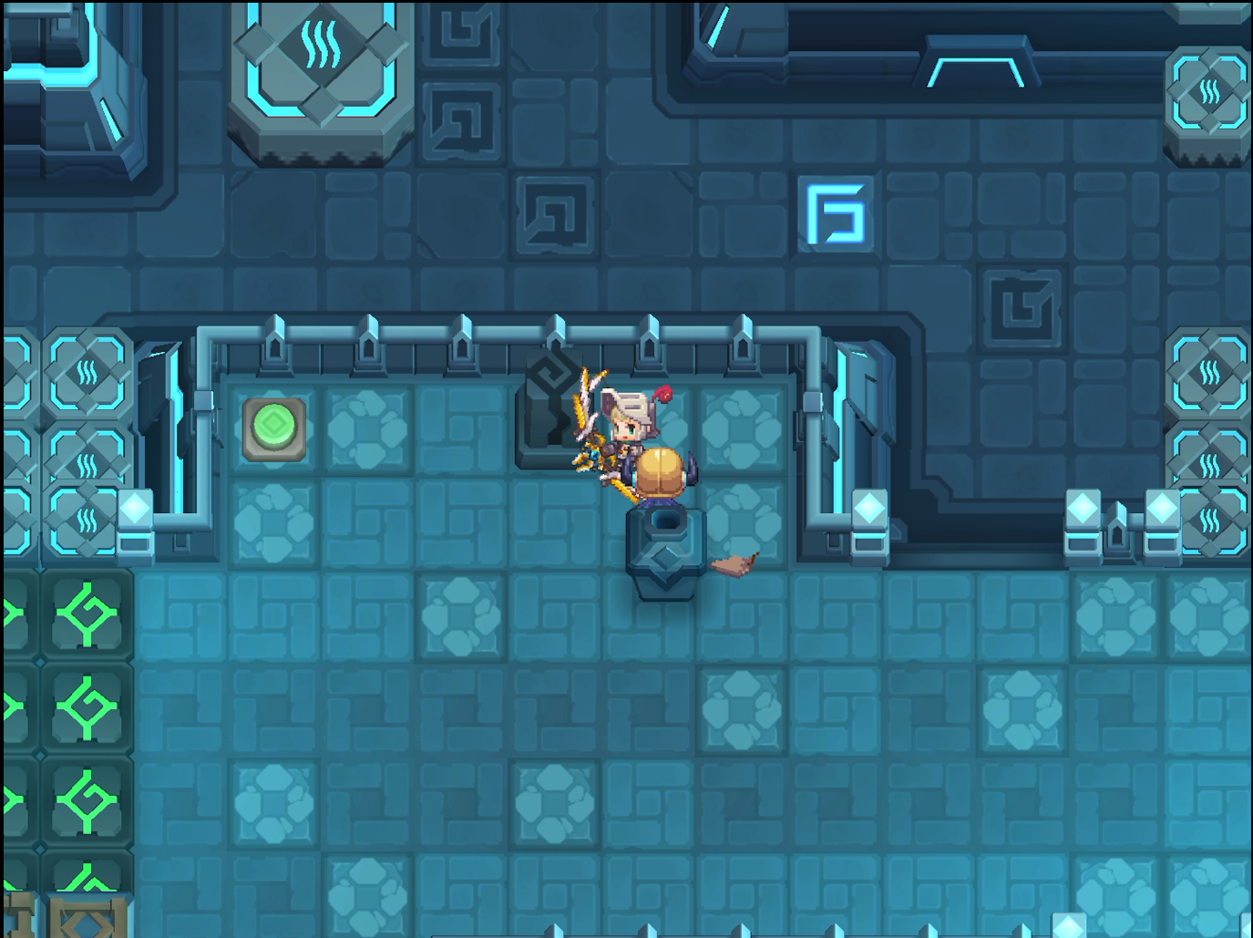 스위치를 눌러 놓고 길이 막히기 전에 사진 상의 위치까지 이동해야 한다. 반대편으로 넘어간 다음에 구멍이 보이는데, 왔다갔다 반복하면 구멍으로 빠질 수 있다.