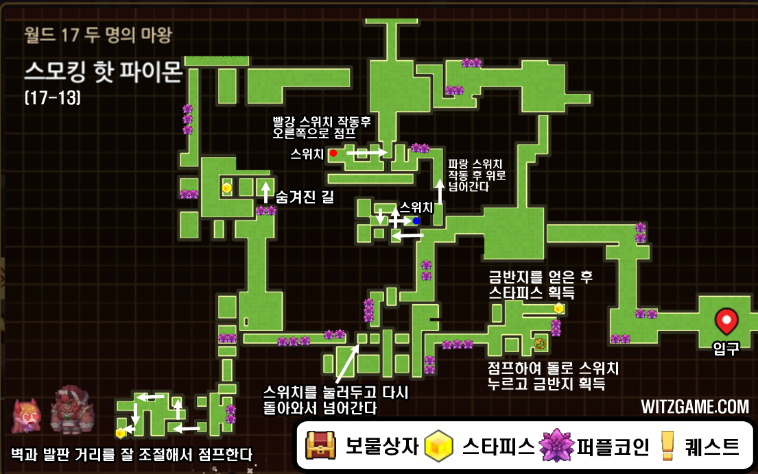 가디언테일즈 월드 17-13 스모킹 핫 파이몬 공략입니다. 월드 17-3의 서브 스테이지인데 전투는 없지만, 벽과 거리를 고려한 점프가 중요합니다.