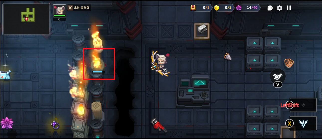 중앙방(①)은 말뚝을 조합해 넘어갑니다. 오른쪽 방(②)은 쥐폭탄을 조합해 큰돌을 부수고 갑니다. 마지막 왼쪽방(③)은 화로를 조합해 박스를 태우고 말뚝을 타고 넘어갑니다.