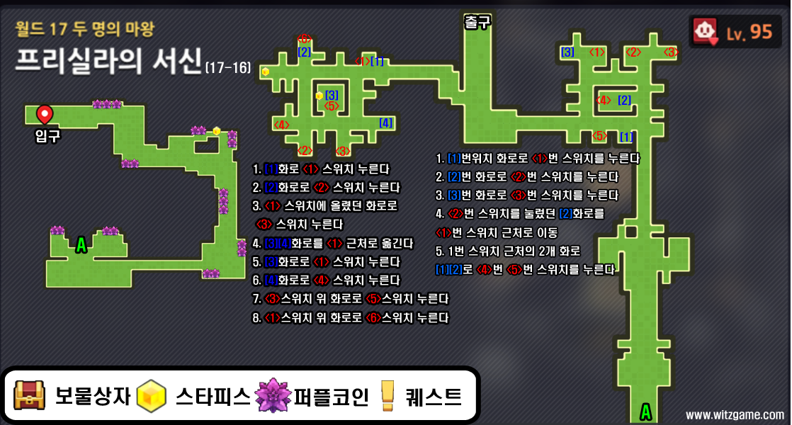 가디언테일즈 월드17-16 프리실라의 서신 공략입니다. 전투는 없지만 미니게임때문에 꽤 시간이 필요한 스테이지입니다. 스위치를 순서대로 눌러야 하지만 아래 공략 사진에 순서를 표시해두었으니 참고하시면 됩니다.