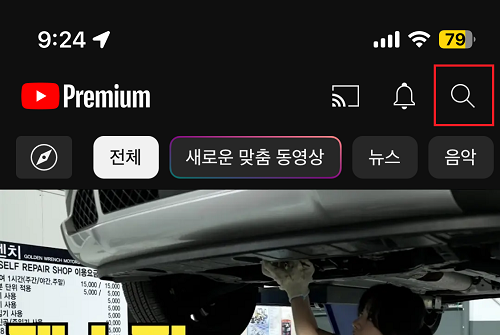 1. 유튜브 뮤직 앱을 실행한 후 오른쪽 상단의 돋보기 아이콘을 클릭합니다.