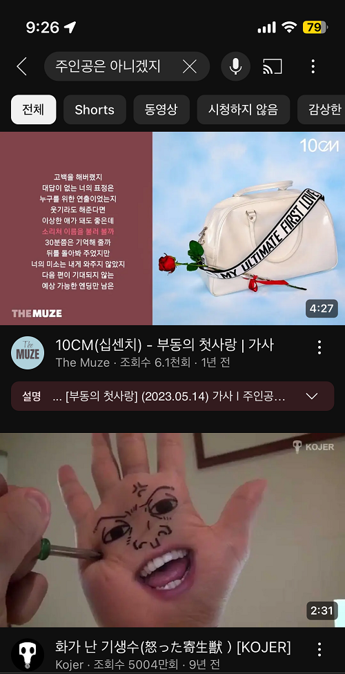 6. 10CM의 부동의 첫사랑 한소절을 흥얼거려봤는데 가사가 좀 틀리긴했지만 검색이 되는 모습입니다.