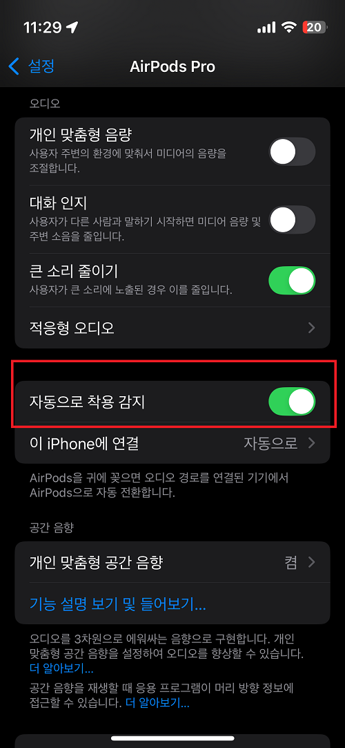 이것은 에어팟 설정의 자동 착용 감지 설정때문인데요. 에어팟 한쪽을 빼도 계속 소리가 나오는 설정 방법입니다.