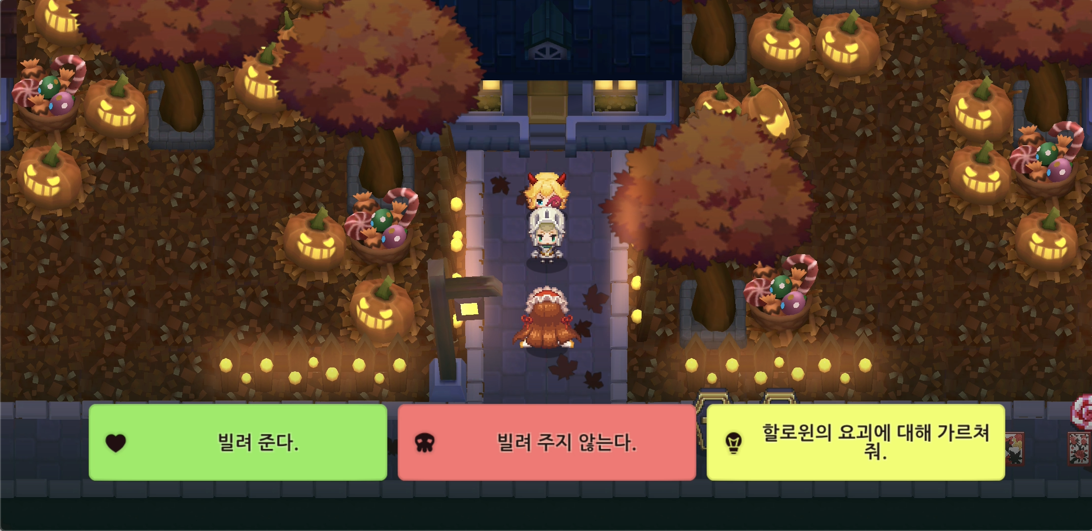 4. 다시 '할로윈의 밤'에 들어와서 넘어지는 아이를 잡으면 공주를 밀치고 달아납니다. 세번째 미니 게임 '사탕 받기'를 깨고 나면 다시 미야가 사탕을 빌려달라고 합니다. 그런데 '할로윈의 요괴에 대해 가르쳐 줘.'라는 선택지가 추가됩니다. 해당 선택지에서 추가 정보를 얻을 수 있습니다. 역시 오른쪽 나가서 스테이지를 종료합니다.