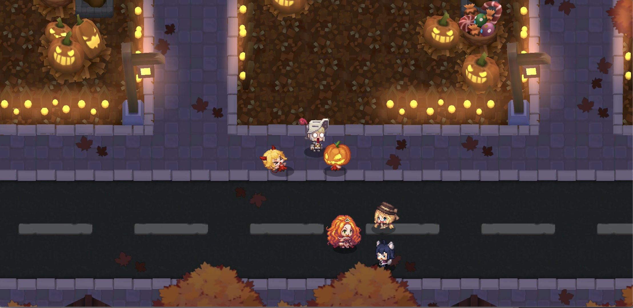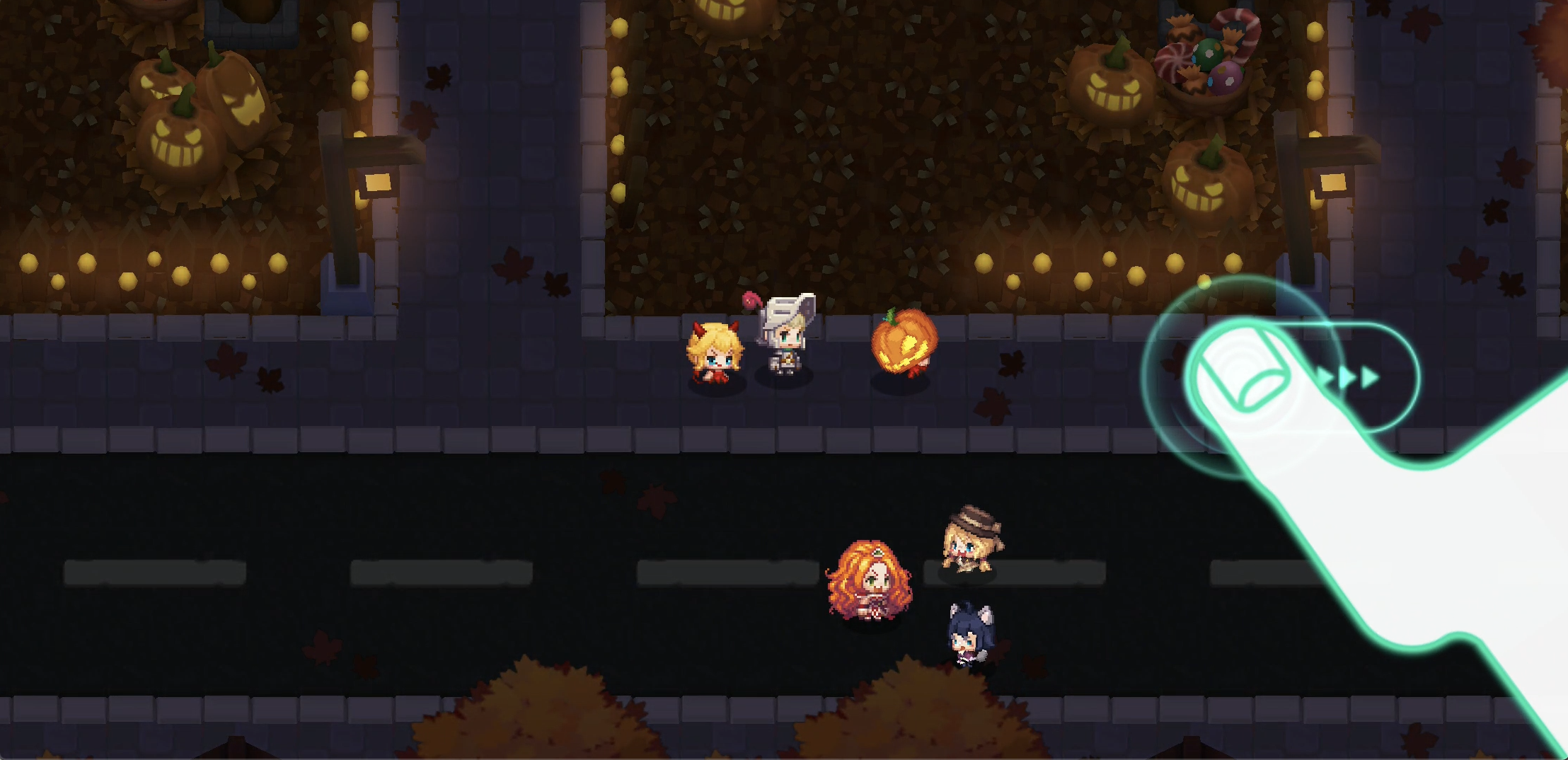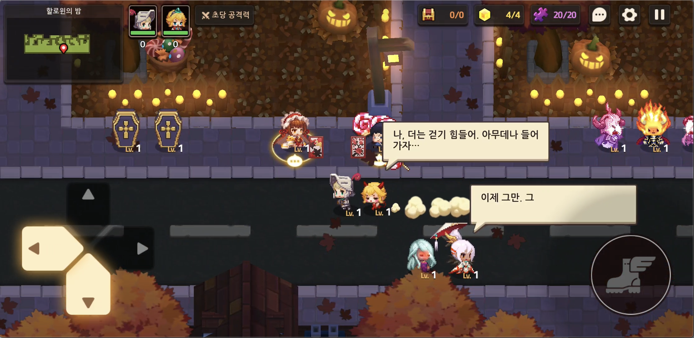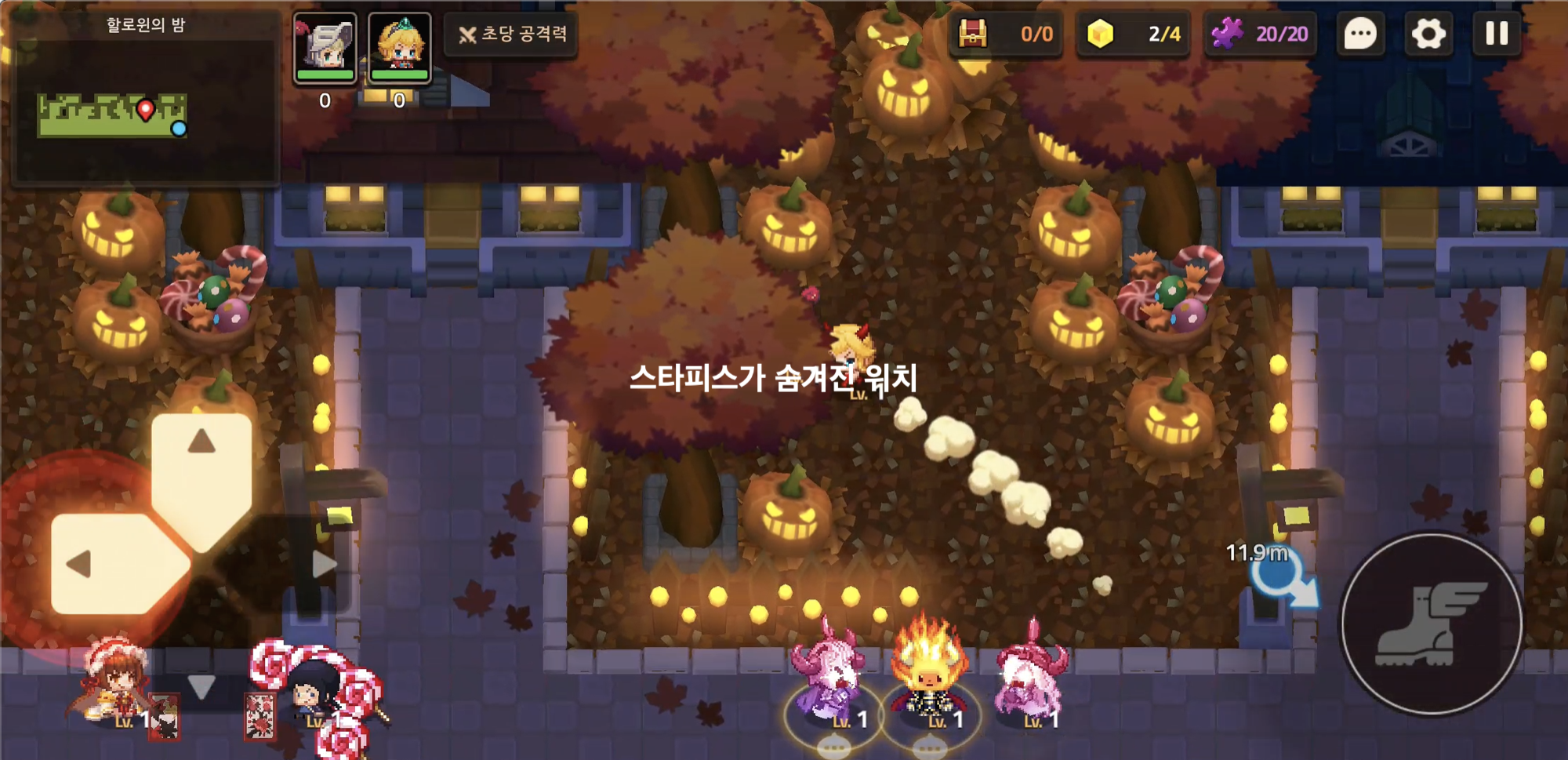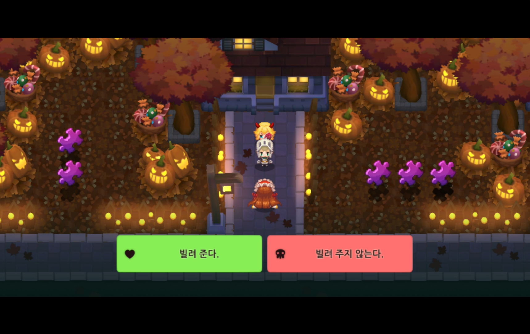 5. 다시 가디언 테일즈 단편집 '할로윈의 밤'에 진입하여 호박탈을 쓴 아이가 넘어질 때 잡아줍니다. 만약 호박탈 아이가 등장하지 않는다면 마을 주변을 빙글빙글 돌아줍니다. 공주가 점점 짜증을 내다가 마지막에 정체를 드러냅니다.