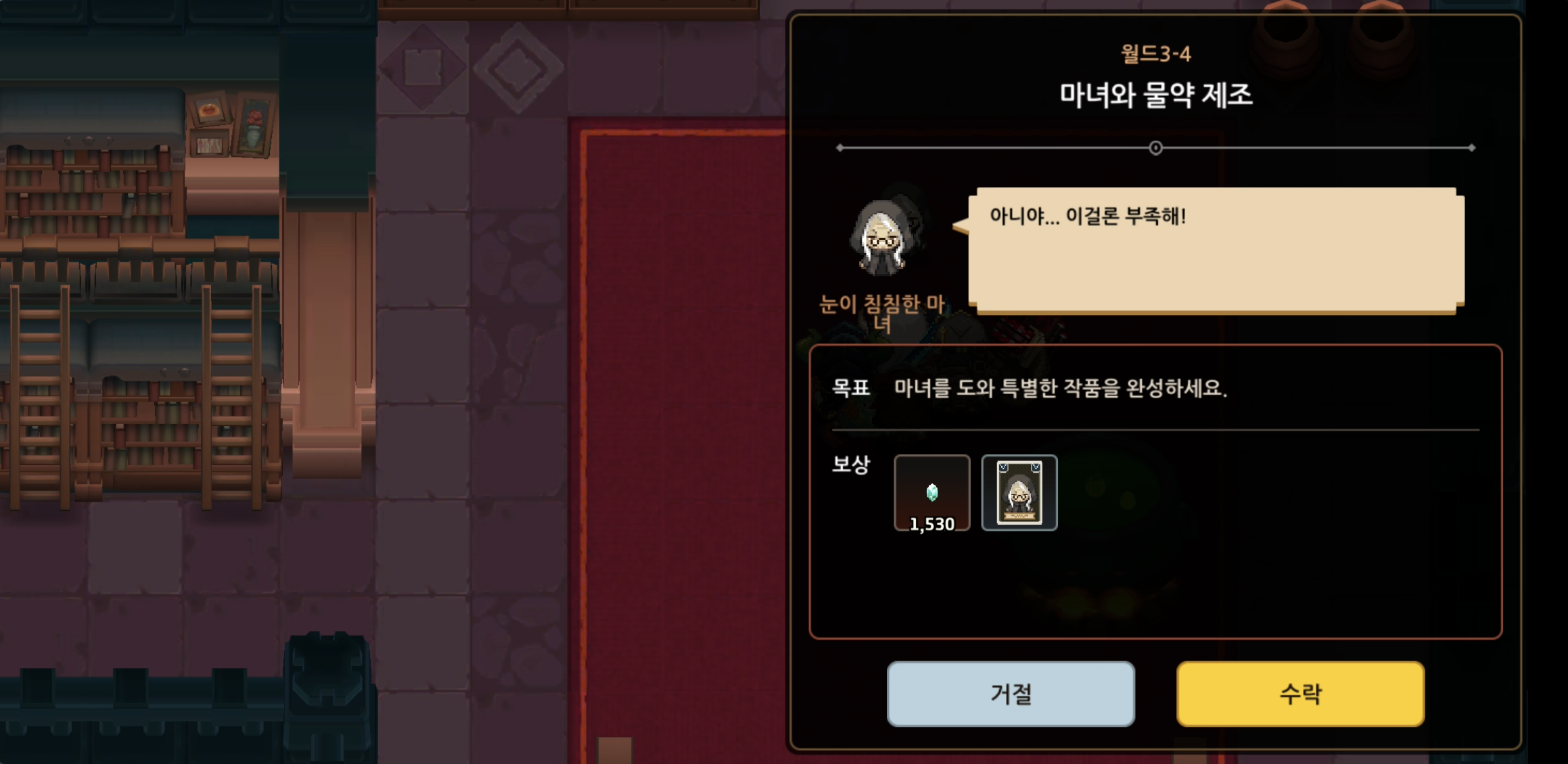 ■ 월드 3-4 마법학교 3층 - 마녀와 물약 제조 퀘스트 완료(왕초보 괴식 요리)