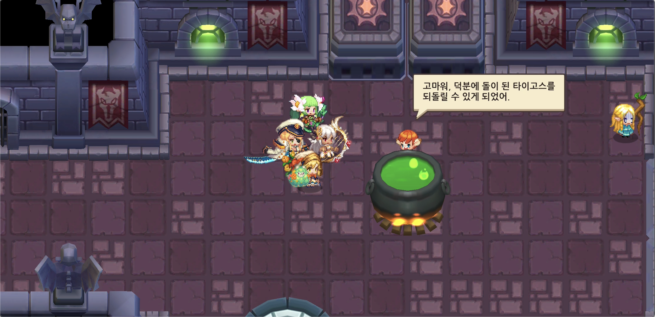 다시 월드 3-3 돌아가 석상으로 변한 파비와 라비에게 '미노타우루스와 라바 슬라임 스튜'를 뿌리면 파비와 라비가 정상으로 돌아오고, 동료로 합류합니다.
