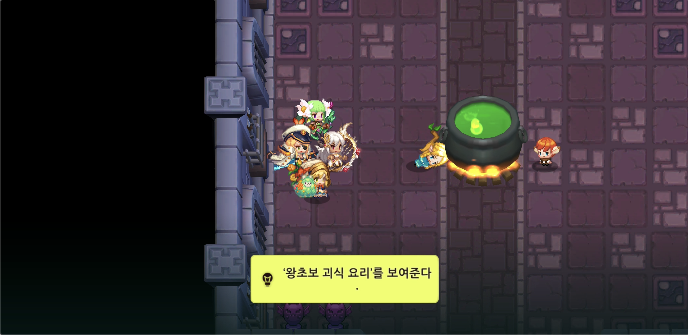 월드 3-4 마법학교 3층에서 '마녀와 물약 제조' 퀘스트를 받습니다. 마녀가 원하는 재료 '싱싱한 도마뱀', '붉은 눈 곰팡이', '식인꽃'을 구해 주고 퀘스트를 완료합니다. 물약 재료는 모두 마녀 근처에 있기 때문에 금방 구할 수 있습니다. 퀘스트 완료 보상으로 '왕초보 괴식 요리' 요리책을 얻습니다.