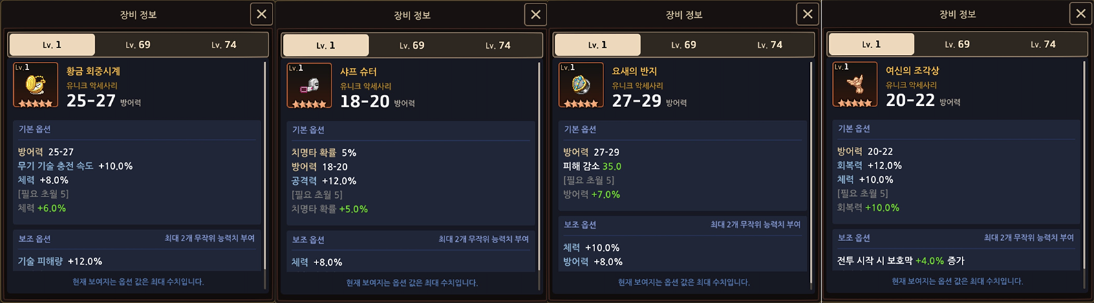 저는 일단 초보자분들은 레전드 악세보다 유니크 악세 착용이 좋다고 생각하고, 저 역시 유니크 장비를 초월하여 사용하다가 전투훈장 악세사리(미노타우루스, 매드팬더)로 넘어왔습니다. 초반 유니크 악세사리 착용의 장점은 아래와 같습니다.