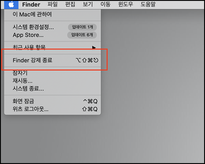 2. 맥북 왼쪽 상단의 애플 로고를 클릭 - 강제 종료를 클릭하여 실행 중인 프로그램을 직접 종료하는 방법