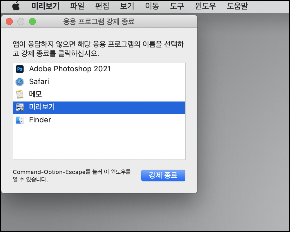 가) 강제 종료 : Command + Option + Esc