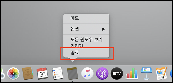 1. 하단바에 마우스나 트랙패드를 사용하여 보조클릭(탭)을 통해 직접 종료하는 방법