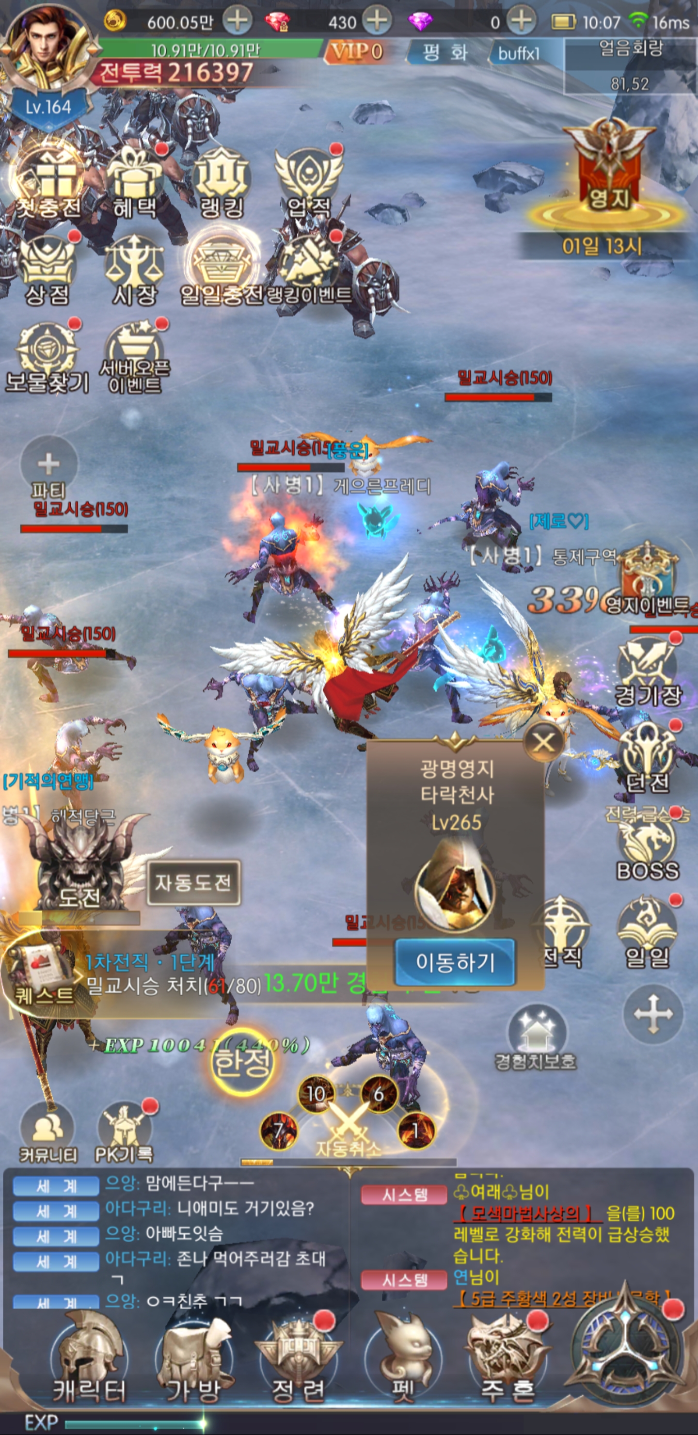 기적의 검 화면 왼쪽 하단에 표시되는 몬스터 사냥 퀘스트는 자동으로 진행되므로 게이머가 신경쓸 부분은 전혀 없다.