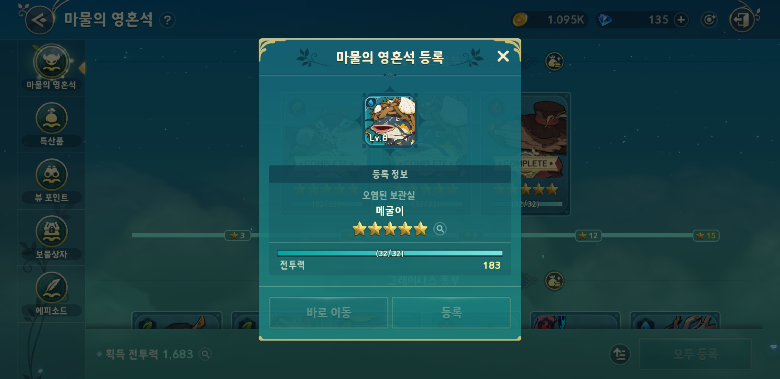 지하수로 오염된 보관실에서 메굴이 마물의 영혼석을 등록하면 전투력(183)과 크리티컬(61)이 상승한다.