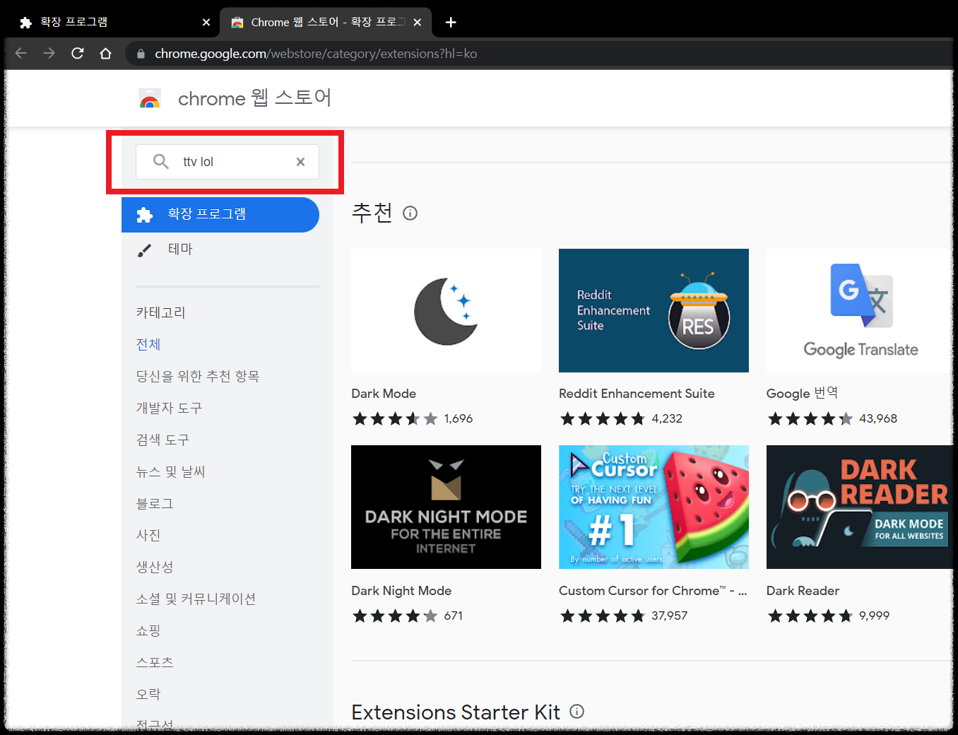 ⑤ 왼쪽 상단 검색창에서 TTV LOL 검색