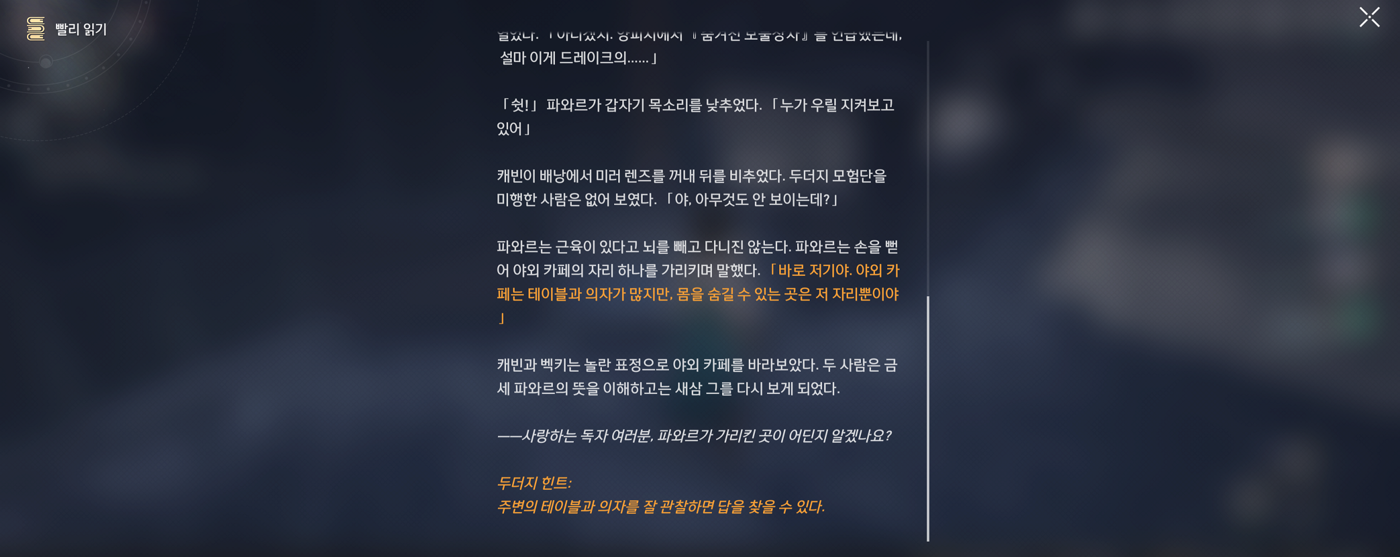1. 뜻밖의 양피지 위치 : 변방 통로 상층 구역 야외 카페에 있다고 힌트를 줍니다.