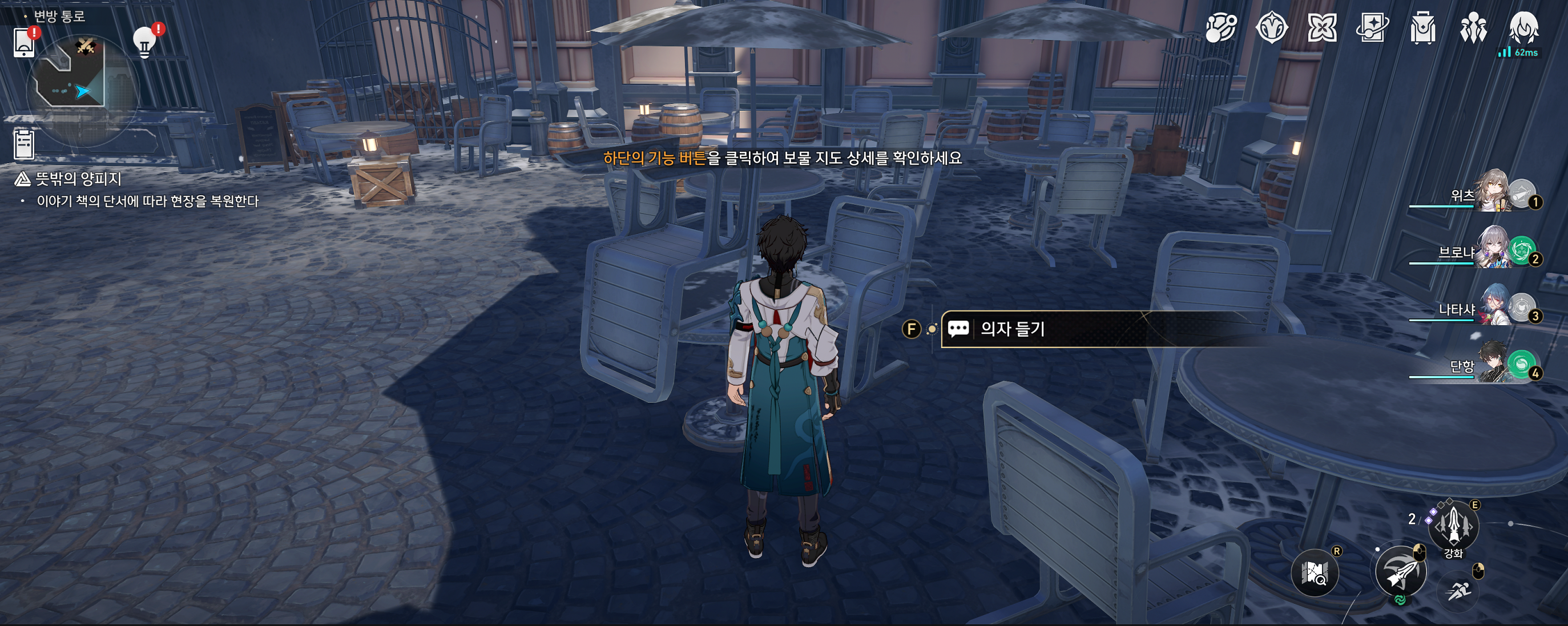야외 카페 지역 벤치 위에서 힌트를 얻을 수 있습니다. 주변의 테이블과 의자를 잘 관찰하란 문구가 적혀 있는데, 테이블 위에 올려진 의자를 조사하면 챕터을 찾을 수 있습니다.