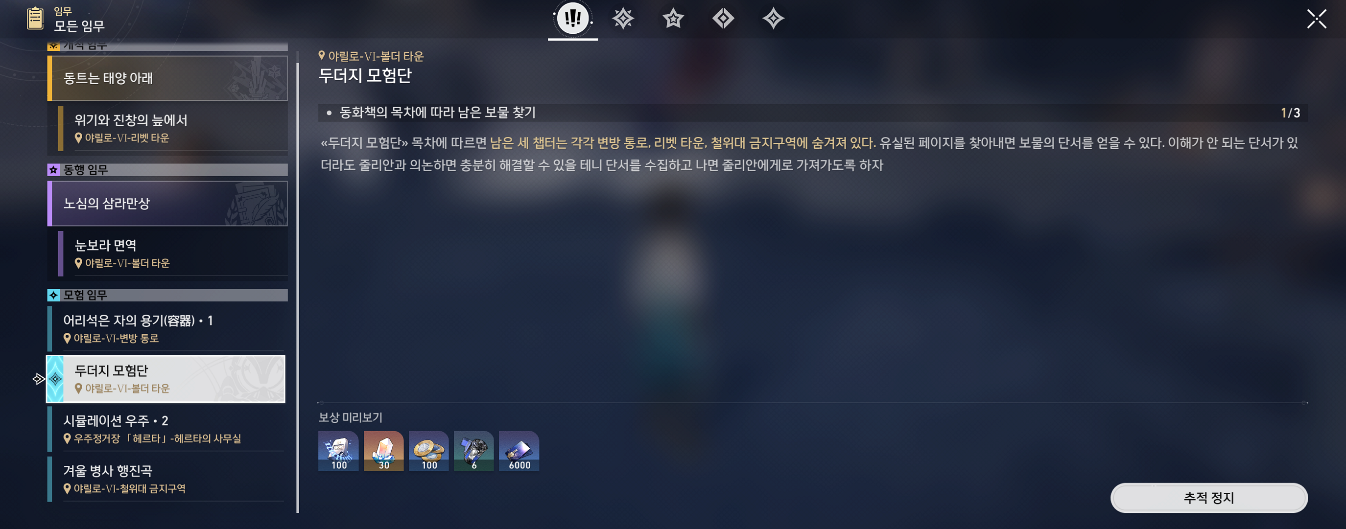 붕괴 : 스타레일 [두더지 모험단]의 남은 세 챕터의 위치입니다. 각각 변방 통로, 리벳타운, 철위대 금지구역에 숨겨져 있으여, 다른 퀘스트와 달리 지도의 위치 추적 기능을 쓸 수 없습니다.