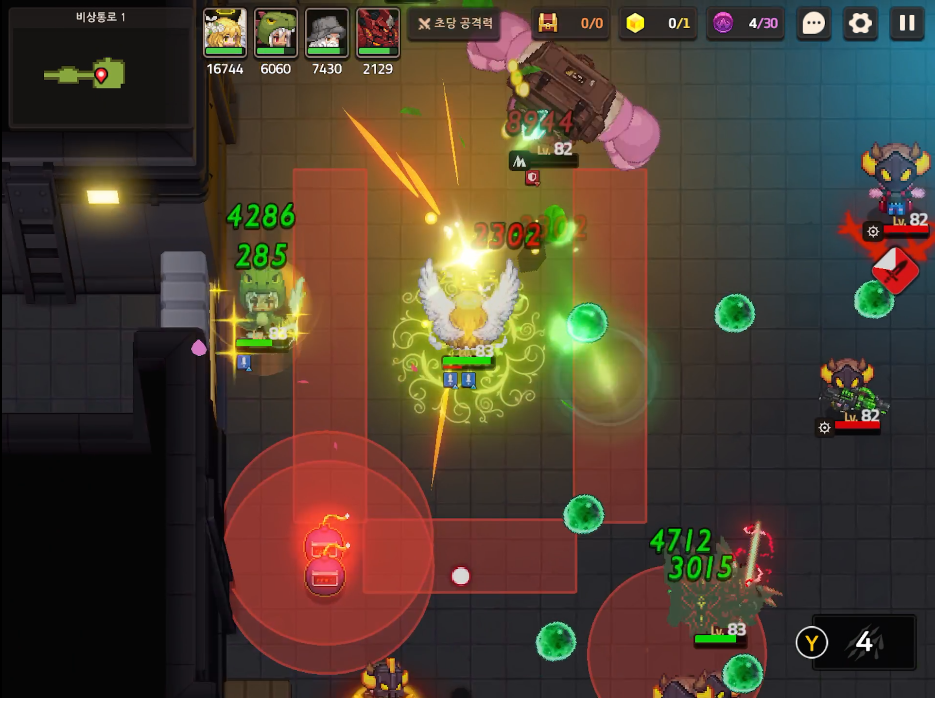 레이저는 폭탄에 비해 맞아도 피해가 크지 않으니 바닥을 잘 보시고 폭탄을 먼저 피하기길 바랍니다. 그리고 지원가 근처에서 적들을 하나씩 처리하는데 집중하면서 전투를 진행해야합니다.