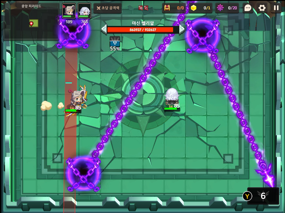 1페이즈의 큰 보라색 구슬이 3개 나옵니다. 1페이즈와 동일하게 갈고리의 위치를 적절한 곳으로 유도하여 피합니다. 갈고리의 위치를 아래 방향으로 유도하면 공격할 틈을 만들 수 있습니다.