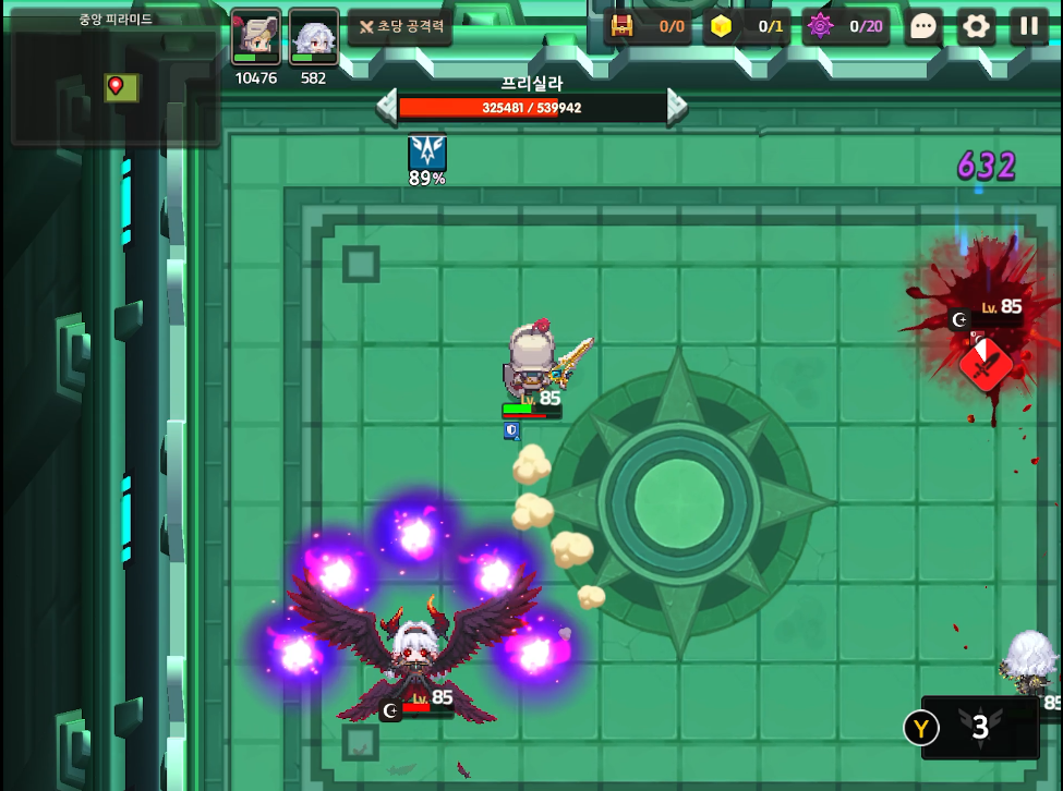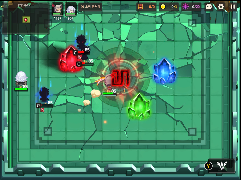 초록, 파랑, 수정 3개의 수정이 생성됩니다. 중앙의 문자와 동일한 색의 수정 뒤로 숨어야 합니다. 자세히 보면 중앙의 문자의 색과 동일한 색의 수정 뒤에 그림자가 있습니다. 강력한 전체 공격이므로 반드시 피하도록 합니다.