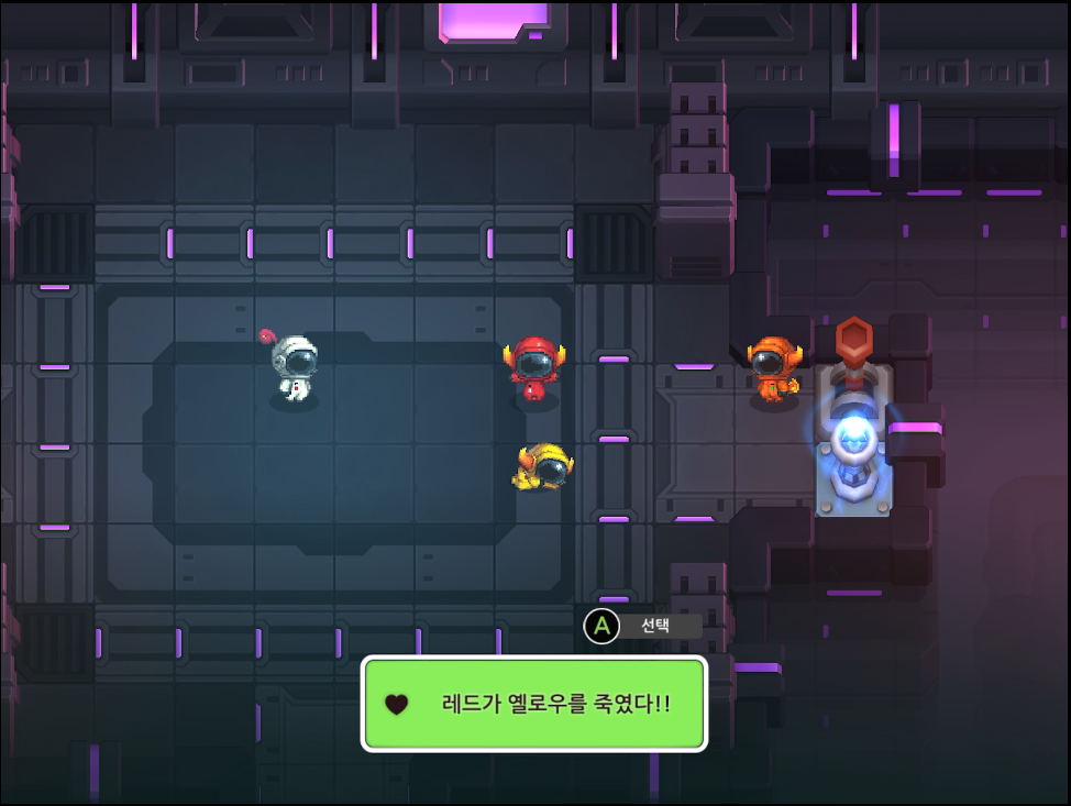 남은 옐로우, 레드, 오렌지와 함께 이동합니다. ④의 위치에서 레버를 작동하여 불을 끄고 아무나 1명 제거합니다. 여기서는 옐로우가 제거되었습니다. 레드를 범인으로 지목하여 함선 밖으로 퇴출시켜 총 6명을 제거합니다.