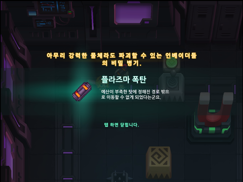 두번째 플라즈마 폭탄은 가시를 피해서 작은 돌을 밀어와야 합니다. 한번에 밀고 나올 수가 없으니 가시를 피해서 요리조리 움직여 인베이더가 움직이는 경로까지 돌을 밀어줍니다.